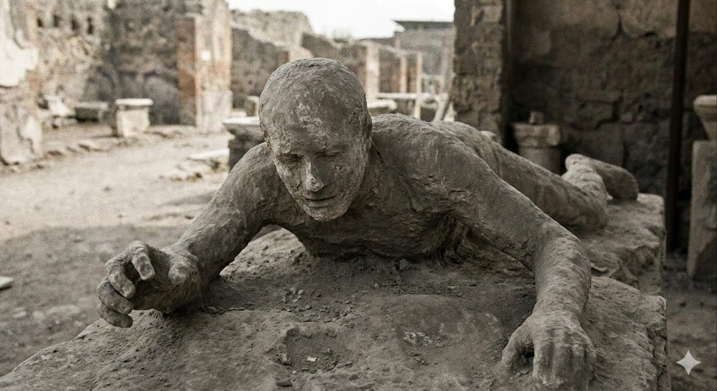 Pompeii knew Vesuvius was a mountain. They didn’t know it was a volcano. Or they knew and had normalised the risk. When it erupted, some were found mid-gesture. Eating. Arguing. Reaching for something on a table.